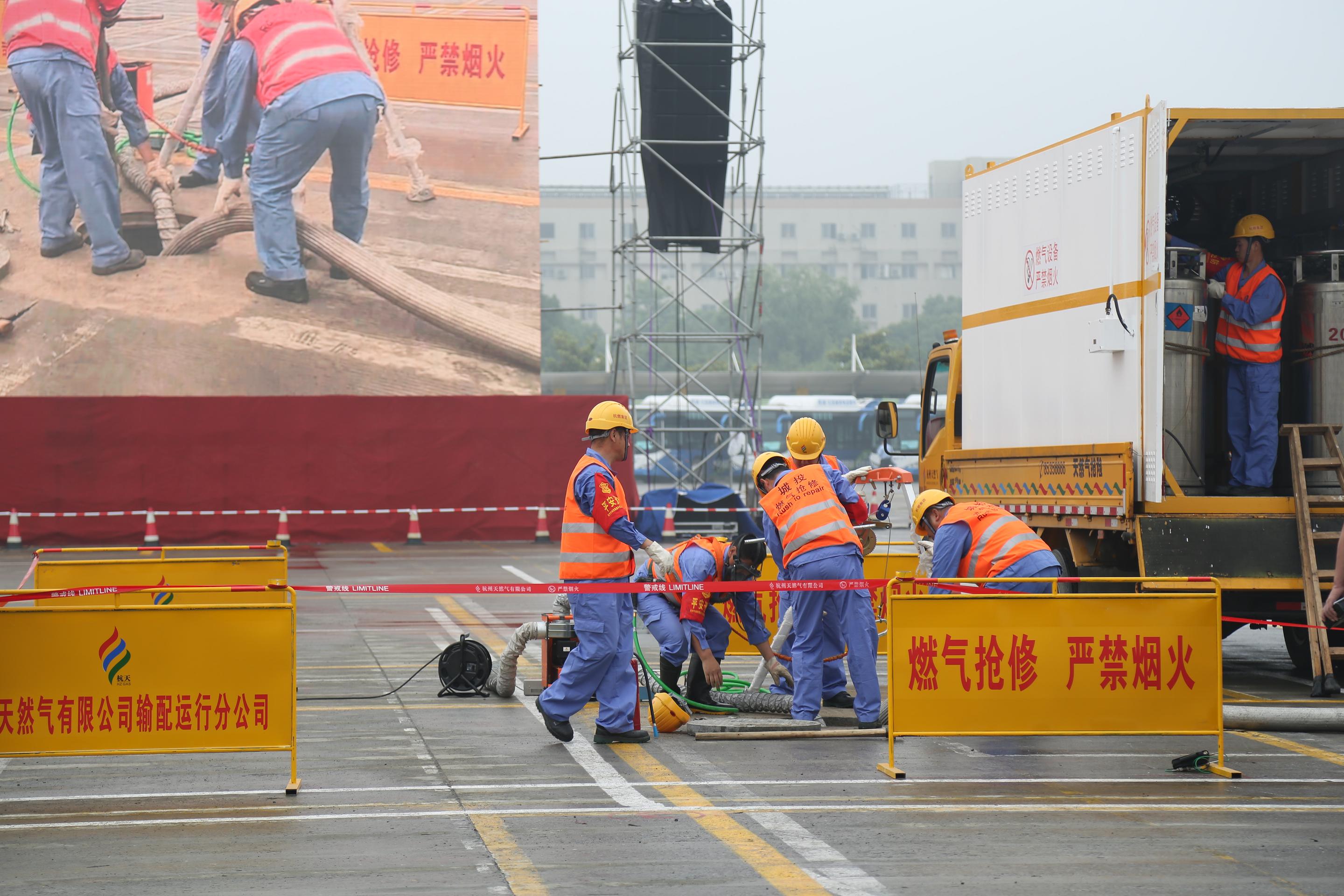演習環節情節逼真、緊張有序,模擬的是重點保障區域內的一家非重點用戶發生了液化氣泄漏及燃爆,泄漏的液化氣集聚在下水井內,因燃爆導致下水井附近的天然氣閥門井內膨脹節發生變形。為了保障該天然氣管道供應的重點場所及用戶安全穩定不間斷用氣,在修復膨脹節的過程中,通過應急氣源撬對用戶臨時供氣。早在4月份,燃氣集團即開始了應急演練的籌備工作,演練團隊充分發揮“工匠精神”,逐字推敲演練腳本,精準定位演練動作,通過30余次的不斷演練和反復修改,使得演練既逼近真實,又具有較高的現場觀賞價值。此次演練不僅腳本上臻于至善,還體現了內部4家參演單位間的緊密配合、外部消防的完美對接,更是貼近主題,體現在峰會保障期間對重點用戶安全穩定供應的應急處置與響應的完美檢驗。
