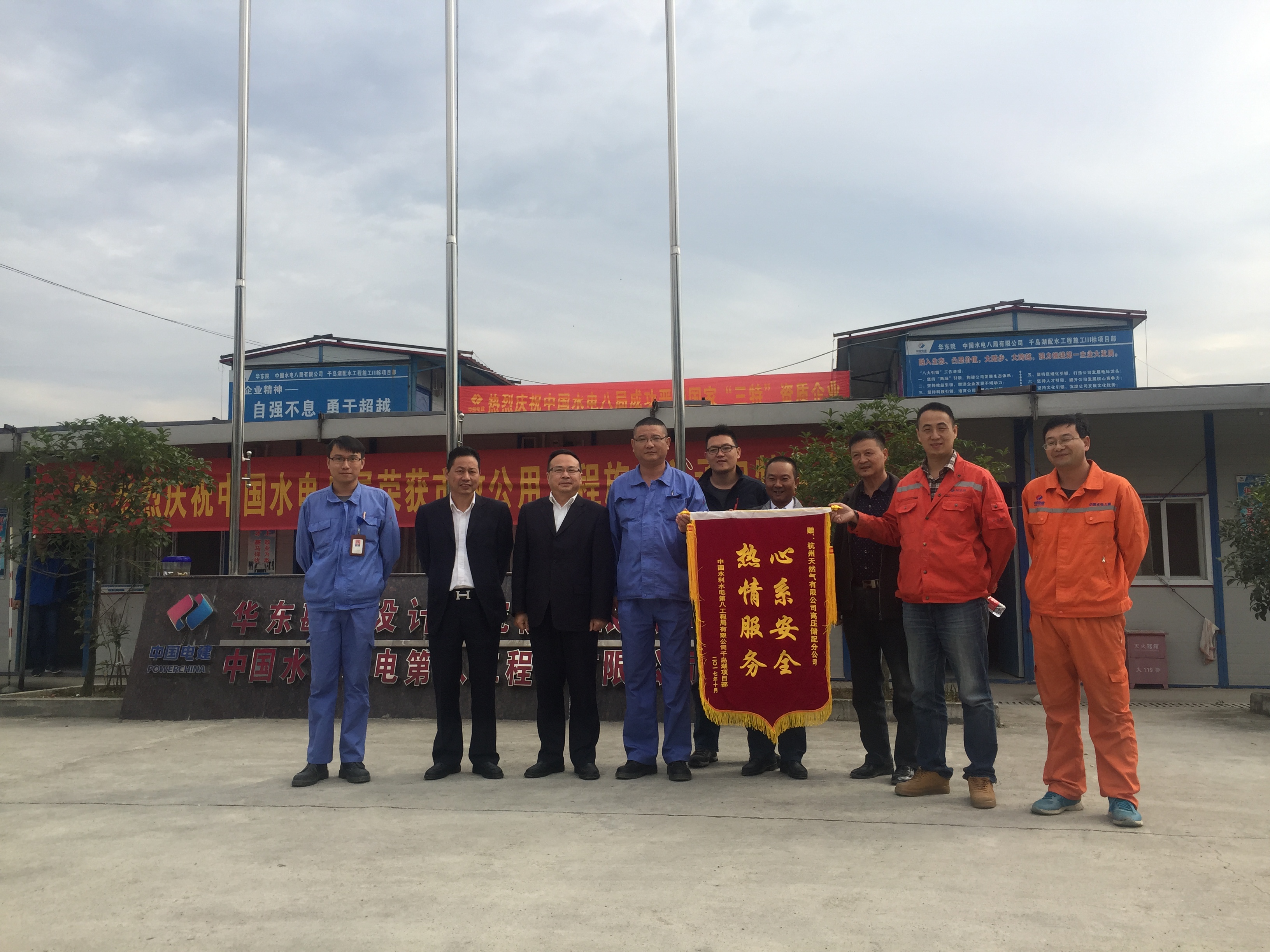 11月6日上午,中國(guó)水利水電第八工程局千島湖項(xiàng)目部向杭天高壓儲(chǔ)配分公司送上繡著“心系安全,熱情服務(wù)”的錦旗,并代表業(yè)主方——杭州市千島湖原水股份有限公司,對(duì)公司巡檢監(jiān)護(hù)人員在千島湖飲水工程施工期間的積極配合和辛勤付出表示衷心感謝。