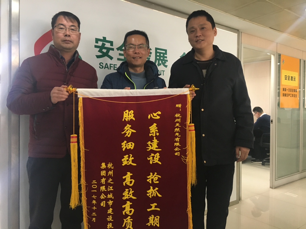 2月2日下午,杭州之江城市建設投資集團有限公司負責人給管網輸配分公司竺恩惠、富君、錢峰等九人送來一張張寫有“2017熱情服務,為客解憂先進個人”的榮譽證書;2月8日上午,該公司代表再次來到七堡,送上一面寫有“心系建設搶抓工期 服務細致 高效高質”的錦旗,感謝分公司的密切配合和鼎力相助。