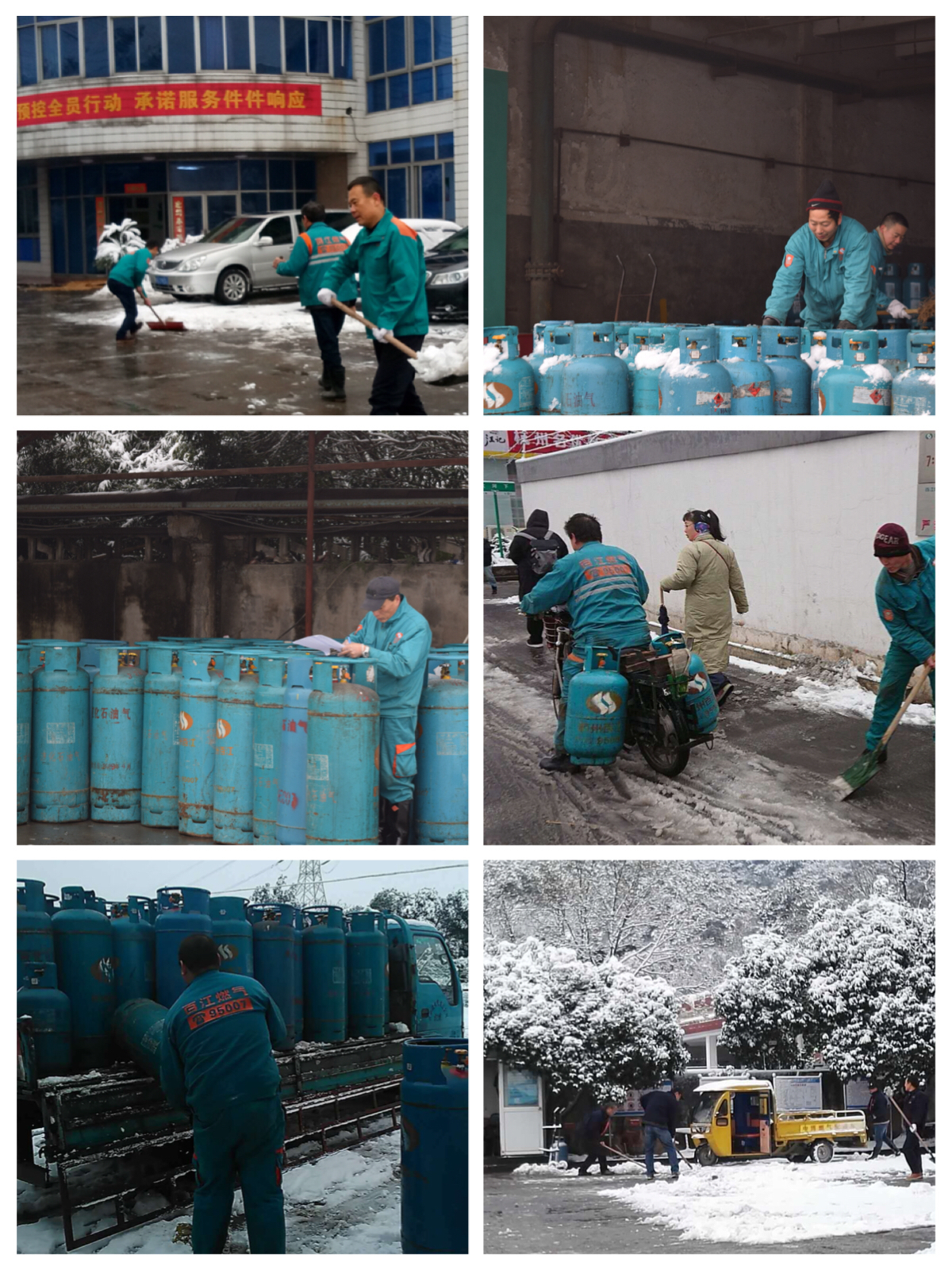 25-26日,杭州百江領導班子、黨員干部帶頭進行東郊廠除冰雪作業,確保廠區道路狀況良好,車輛運行順暢。生產部的員工們更是抓緊時間進行充裝作業,認真仔細地進行鋼瓶出廠百分之百檢漏工作,力求用戶用氣不受天氣因素影響。各供應站點積極進行除冰雪作業,在地面上鋪蓋草墊防止用戶進出受到影響。下雪天出行不便,液化氣的配送也更是充滿考驗,為保證用戶用氣不受影響,駕押人員提前到崗,預熱車輛、做好車輛檢查工作,保障車輛配送不受影響,配送過程中做到小心駕駛、輕拿輕放,防止發生突發事故;送氣工們也按照要求做好出車前的安全檢查,冒著風雪奔波在杭城的大街小巷,將一瓶瓶“福氣”送入百姓家。在公司,實行領導24小時帶班,管理人員下一線,應急搶修隊伍也隨時做好準備,切實保證用戶搶修的及時率。余杭中博此次積雪更加嚴重,中博領導班子帶領員工認真進行除冰雪作業,保證各項生產工作安全有序開展。