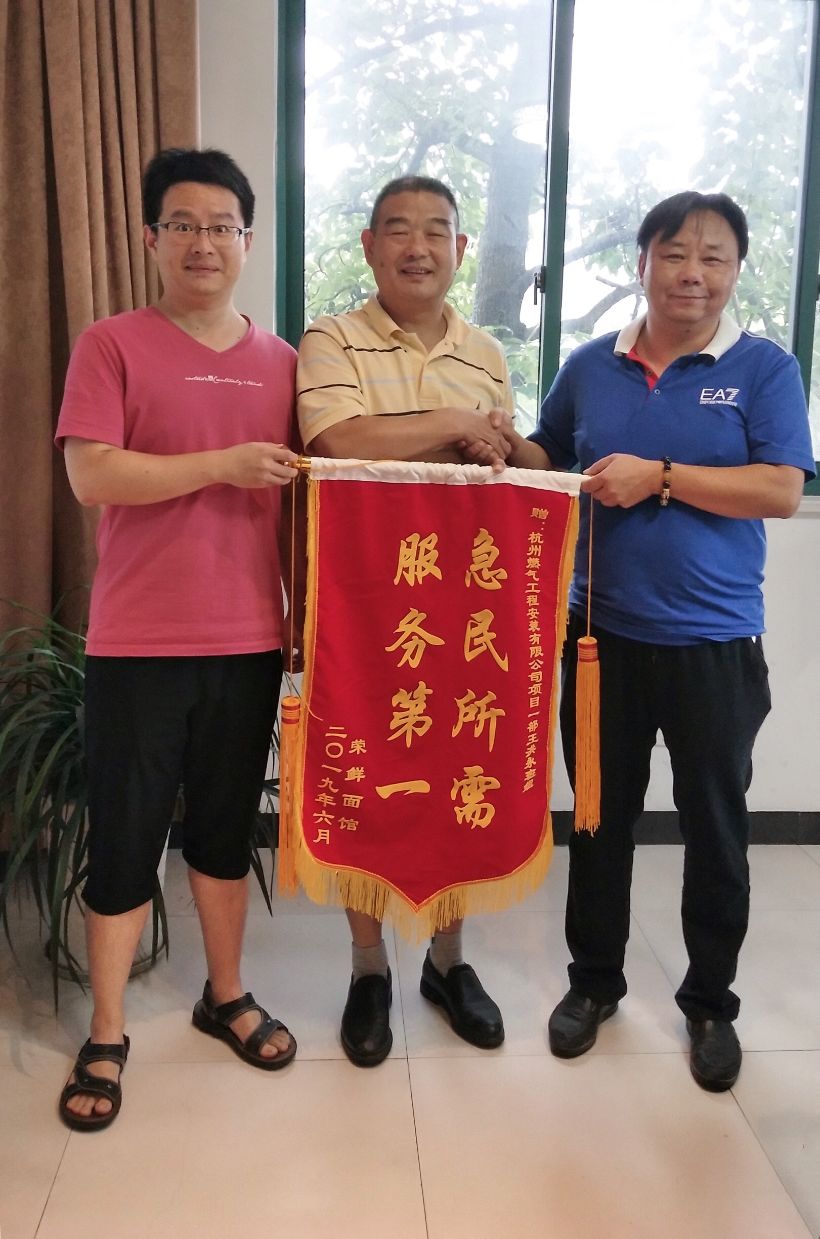 7月9日下午,上城區榮鮮面館老板宋前榮冒雨帶著錦旗“急民所需,服務第一”專程來到工程公司表示感謝,對工程公司項目一部專業、細致、高效、精益求精的施工服務給予了高度贊揚。工程公司副總經理管志鴻代表公司感謝榮鮮面館對工作的支持和肯定。