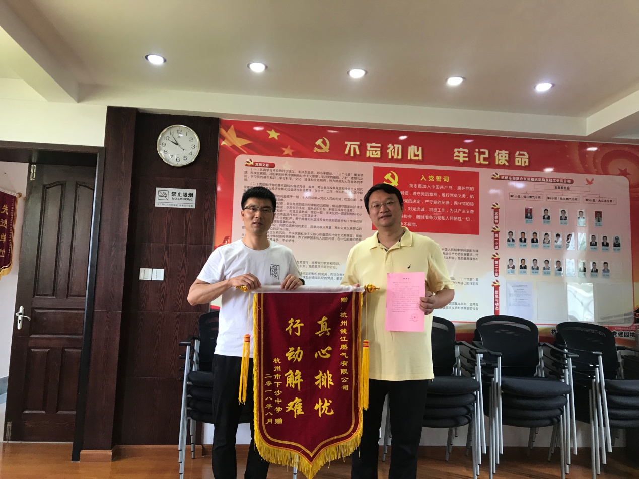 2018年8月31日上午,杭州市下沙中學總務處王主任將一面“真心排憂,行動解難”的錦旗和一封感謝信送到錢江公司,對公司為學校食堂燃氣改造工程的大力支持表示衷心的感謝。