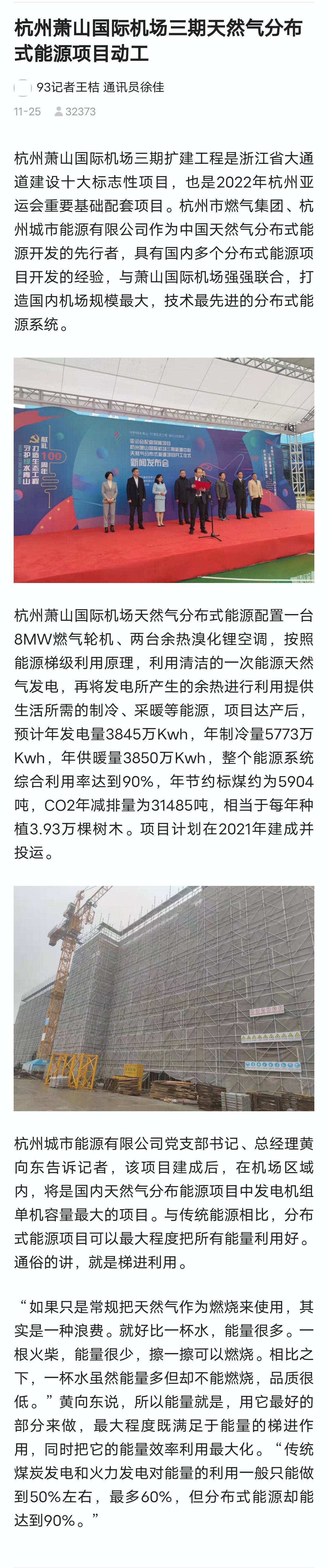 杭州蕭山國(guó)際機(jī)場(chǎng)三期擴(kuò)建工程是浙江省大通道建設(shè)十大標(biāo)志性項(xiàng)目,也是2022年杭州亞運(yùn)會(huì)重要基礎(chǔ)配套項(xiàng)目。杭州市燃?xì)饧瘓F(tuán)、杭州城市能源有限公司作為中國(guó)天然氣分布式能源開發(fā)的先行者,具有國(guó)內(nèi)多個(gè)分布式能源項(xiàng)目開發(fā)的經(jīng)驗(yàn),與蕭山國(guó)際機(jī)場(chǎng)強(qiáng)強(qiáng)聯(lián)合,打造國(guó)內(nèi)機(jī)場(chǎng)規(guī)模最大,技術(shù)最先進(jìn)的分布式能源系統(tǒng)。
