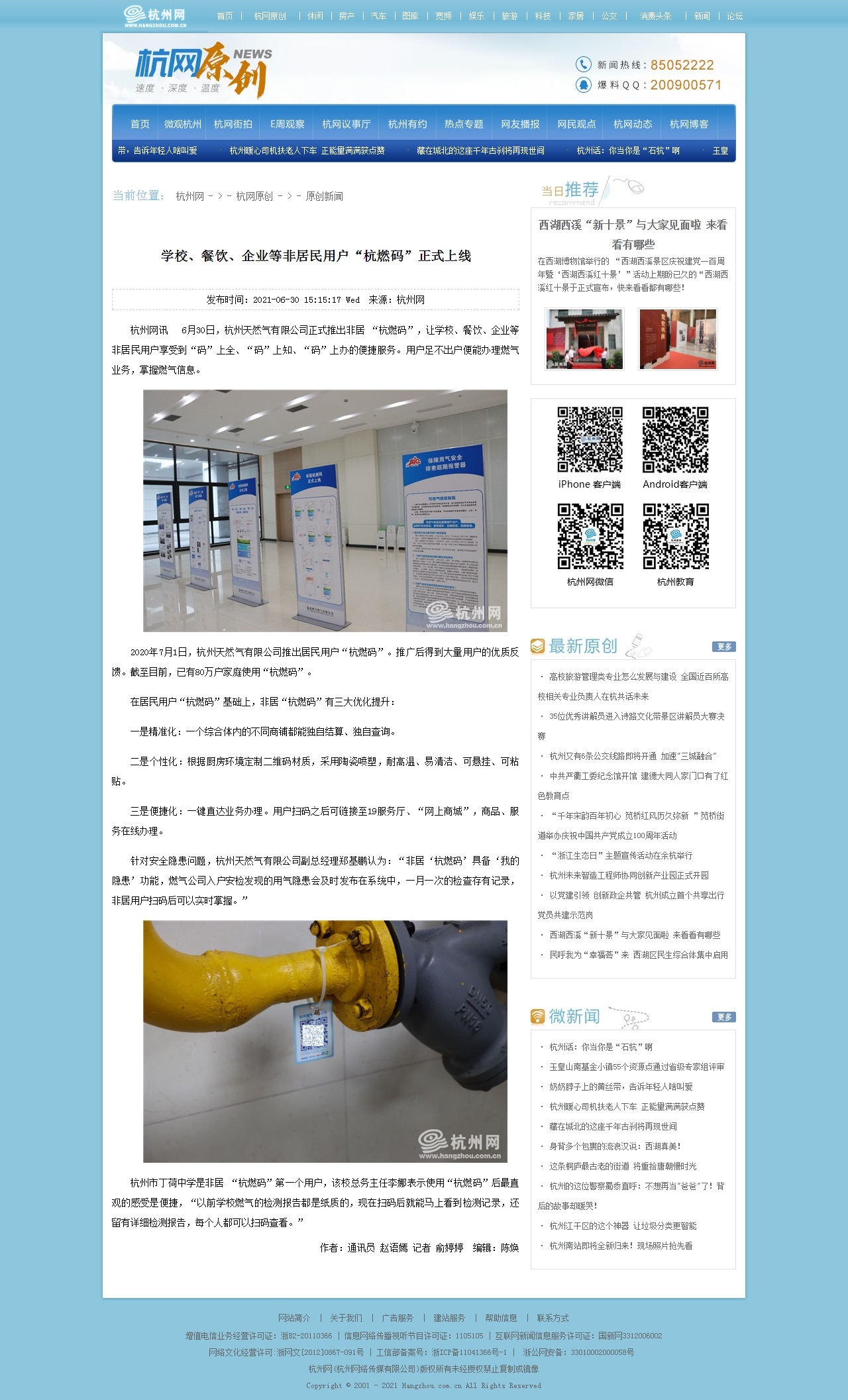 杭州網訊 6月30日,杭州天然氣有限公司正式推出非居 “杭燃碼”,讓學校、餐飲、企業等非居民用戶享受到“碼”上全、“碼”上知、“碼”上辦的便捷服務。用戶足不出戶便能辦理燃氣業務,掌握燃氣信息。