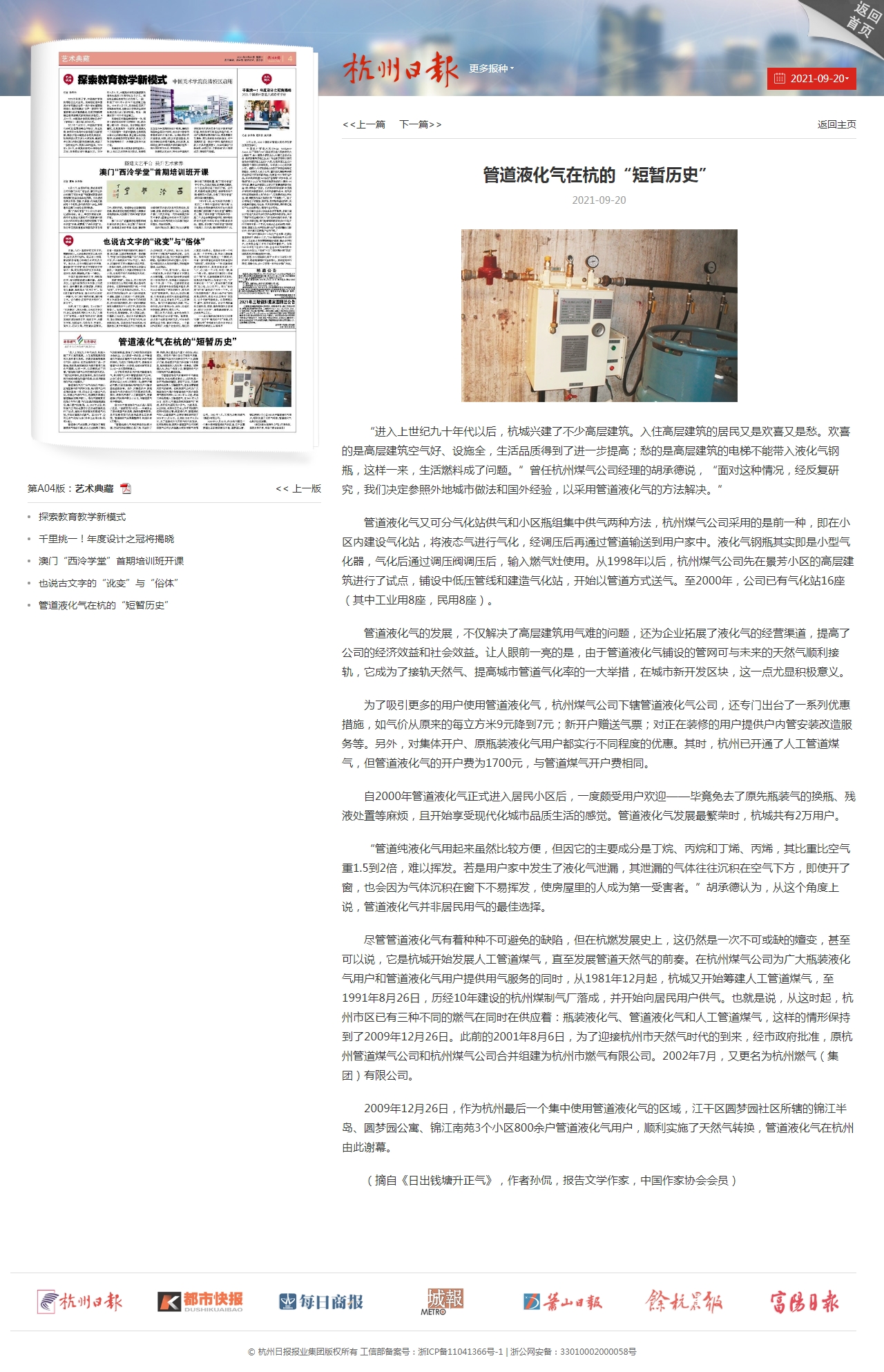 2009年12月26日,作為杭州最后一個集中使用管道液化氣的區域,江干區圓夢園社區所轄的錦江半島、圓夢園公寓、錦江南苑3個小區800余戶管道液化氣用戶,順利實施了天然氣轉換,管道液化氣在杭州由此謝幕。