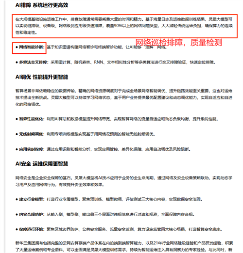 如今AI大模型已成為未來發展的趨勢,網絡與AI融合已經是未來要走的一條路,因此網絡具有AI組件是為給用戶提供未來幾年的擴展;同時主流的廠家已經具有AI運維及巡檢的內容,通過對服務維度進行巡檢后,可對網絡質量進行檢測,并具備AI機器人進行AI化網絡運維;如: