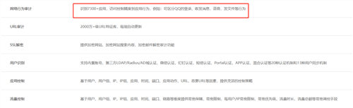 應用及 URL 網絡特征識別庫數量,強調應用及網絡 URL 管控精細度(支持識別 7000 余種應用、3000 余萬條預分類的 URL 地址);