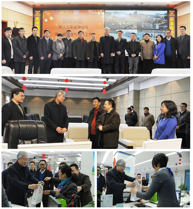 朱金坤副主任一行先后來到天目山路營業廳及應急指揮中心,親切地與燃氣工作人員一一握手,并為工作人員及前來辦理業務的市民送上新年禮物。朱副主任詢問了春節期間燃氣保障工作,集團黨委書記、董事長蘆俊簡要匯報氣量供應、應急搶修等情況。朱副主任代表杭州市四套班子領導向節日期間仍然堅守一線的燃氣集團全體干部職工表示感謝,祝賀大家新年快樂,并祝杭州市燃氣集團事業蒸蒸日上。