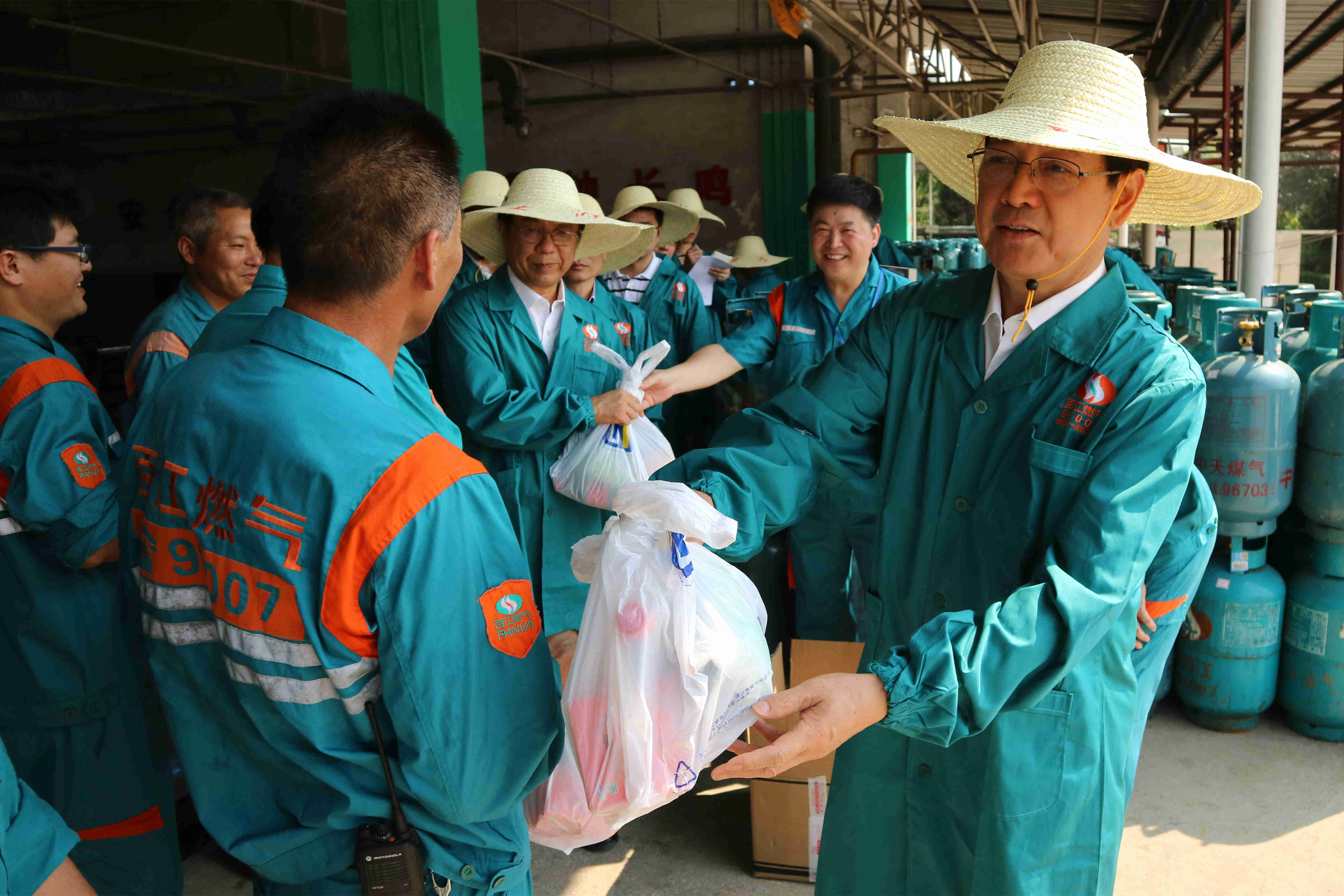 孫主席一行在實地查看了生產作業區儲罐儲液、瓶裝液化氣充裝檢驗等現場作業,并仔細詢問鋼瓶充裝管理、報廢管理情況后,充分肯定杭燃百江公司的安全生產投入及階段性成效。結合杭州市液化氣行業的市場現狀,指出,杭燃百江公司要繼續將“安全”二字認真貫徹到生產銷售全過程,嚴格廢棄鋼瓶的回收管理,絕不讓廢棄鋼瓶回流市場。同時,孫主席要求有關部門嚴厲打擊市場上無證經營“黑氣點”,維護公共安全,共同建設一個安全、和諧的液化氣市場。隨后,孫主席一行與杭燃百江公司一線工作人員一一握手,送上高溫慰問品,感謝他們在持續高溫天氣下堅守崗位,為杭州市民的正常生活提供保障。