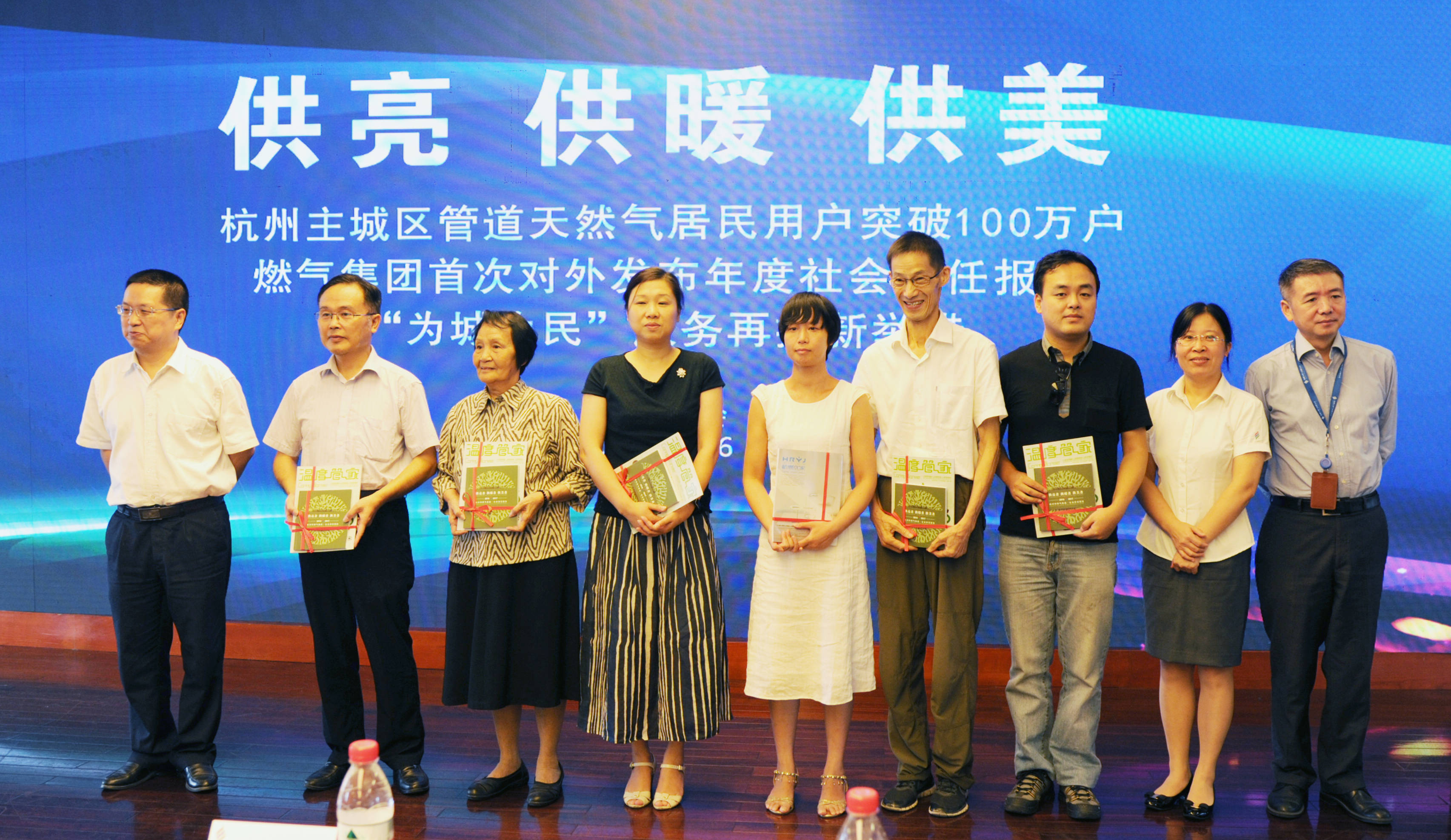 發布會現場,還播放了第1戶管道氣用戶及第100萬戶管道天然氣用戶采訪視頻,蘆俊董事長為第100萬戶用戶頒發紀念品并贈送杭燃優家產品。集團公司王忠平、朱琴君副總經理,杭天公司沈劍平總經理向市民代表及品質監督員贈送《社會責任報告》、《溫度管家》。