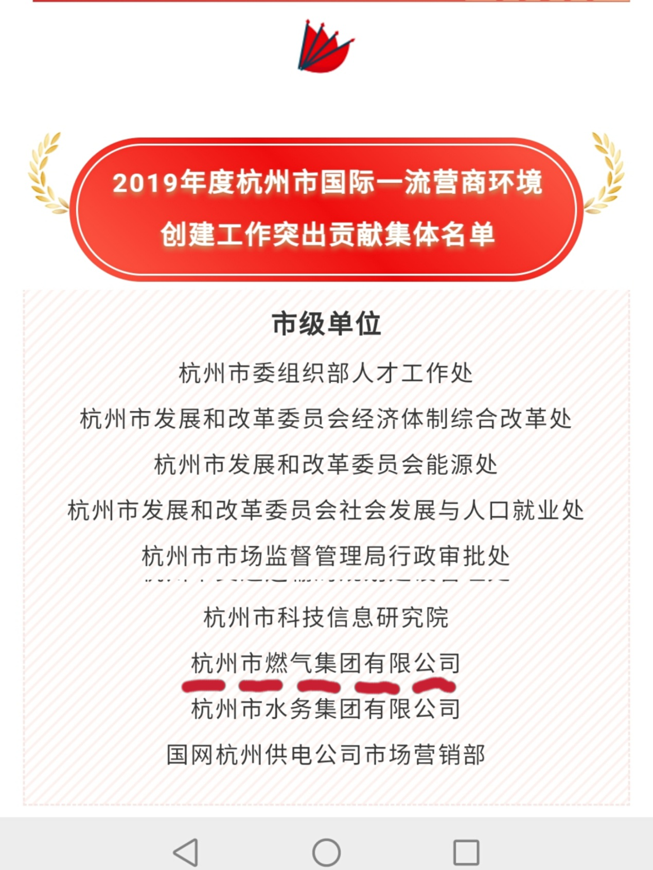近日,杭州市燃氣集團有限公司被市委、市政府授予“2019年度杭州市國際一流營商環(huán)境創(chuàng)建工作突出貢獻集體”。在國家發(fā)改委發(fā)布的《中國營商環(huán)境報告2020》中,杭州營商環(huán)境評價總體排名全國第五。杭燃集團作為用氣報裝標(biāo)準(zhǔn)優(yōu)化和提升的責(zé)任主體,深入貫徹落實市委市政府決策部署,勇?lián)厝巍⒄孀嵏桑钔趦?nèi)部潛力、創(chuàng)新服務(wù)舉措、降低用戶門檻,不僅真正提高了用戶的獲得感和滿足感,更為全市營商環(huán)境評價取得優(yōu)異成績作出了積極的貢獻。