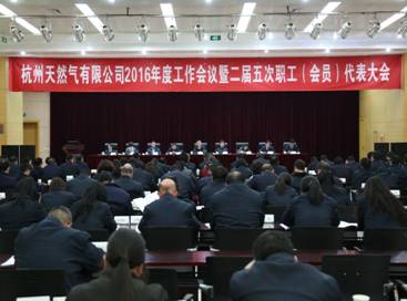 2月23日下午,杭天公司召開2016年度工作會議暨二屆五次職工(會員)代表大會。杭天經營班子、兩級以上中層干部、職工代表以及黨團員代表150余人參加了會議。杭州燃氣集團公司董事長胥東、總經理王東出席會議。
