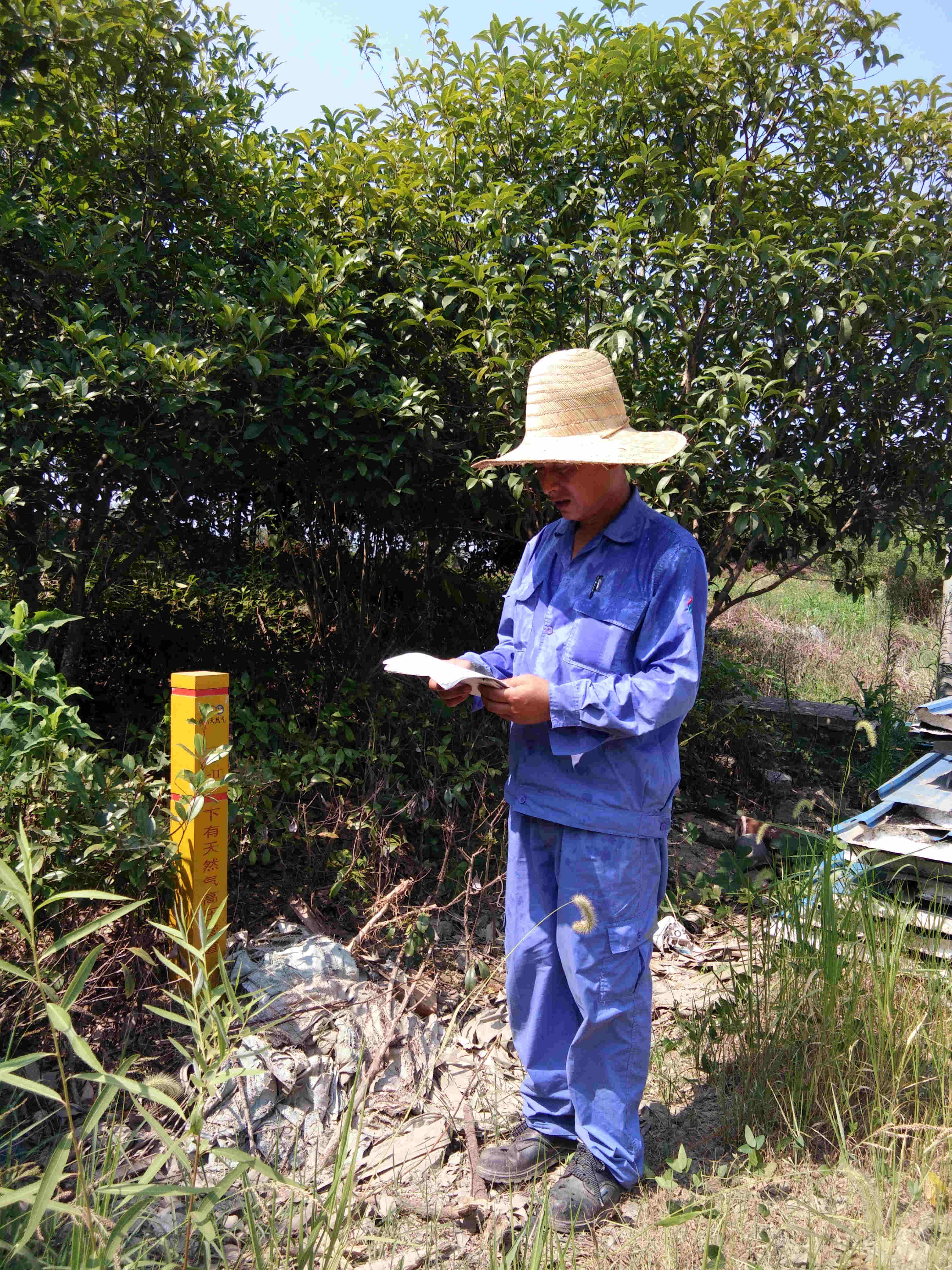 炎炎夏日,高溫熱浪直逼。為了盡可能的避開高溫時段,并按時按要求完成任務,楊國芳每天凌晨4點多就趕往檢測點,為檢測人員帶路并做好現場監護。荒郊野外的檢測點,有的連落腳的地方都沒有,工作環境異常艱苦,除了陽光的炙烤,還有蚊蟲的叮咬。楊國芳與檢測人員一起,仔細對S13、S14管道防腐層進行檢測,不放過任何疑似缺陷點,并將發現的問題及時、詳細記錄,以便后期與檢測單位進行核對。同時,他利用檢測空隙向管線周邊村民開展燃氣安全宣傳工作,進一步提高村民的安全防范意識。在雜草叢生的檢測作業現場,在與村民交談的場景中,楊國芳被太陽曬的黝黑的臉龐、濕透的工裝、沾滿泥土的工作鞋格外顯眼。