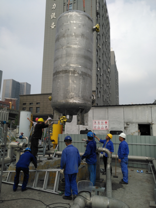 經過前期認真細致的準備,技改工程于7月初全面展開:7月10日,場站液氮置換液化天然氣;7月14日,場站內拆除3000標方/小時的主氣化器及卸液區300標方/小時增壓器;7月19日,搭建儲罐彩繪所用腳手架,在克服臺風暴雨和持續高溫的惡劣天氣影響后,于8月4日完成儲罐彩繪工作;8月2日,完成9000標方/小時水浴式氣化器的基礎澆筑;8月7日,進行消防噴淋測試;8月9日,9000標方/小時水浴式氣化器、500標方/小時卸液區增壓器于場站現場吊裝就位。