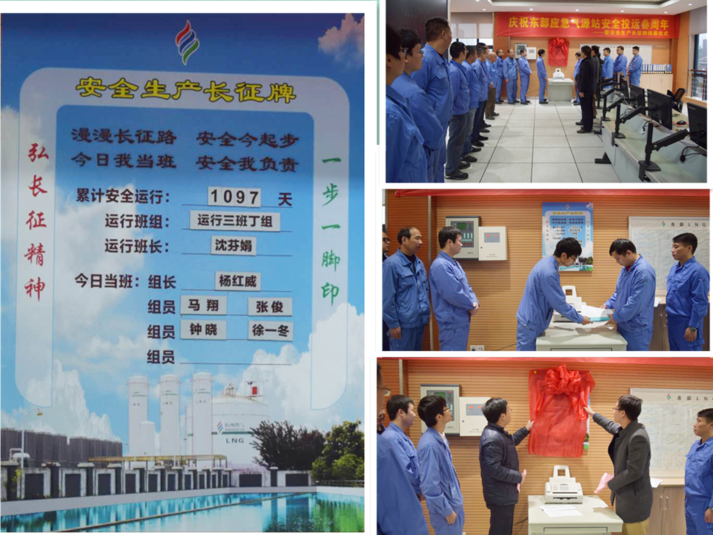 漫漫長征路,安全今起步。截止揭幕式當天,東部LNG應急氣源站自建成投運以來,已安全穩定運行1097天。安全長征牌整體設計為一個安字,以LNG場站作為背景,字體色彩和背景蘊含金木水火土五種自然元素。長征牌上當天的運行班組運行人員情況一目了然,一個安字,一個名牌,一本記錄,一句承諾,一個儀式。分公司設立安全長征牌,旨在提醒每位員工都要具備高度的使命感和責任感,用心做好每一天的工作。