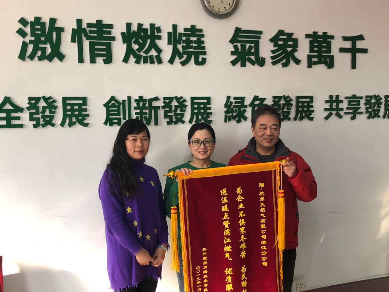 1月21日下午,搜房網(wǎng)軟件開發(fā)基地項目負責人吳薇女士向濱江分公司送上寫有“為企業(yè)不懼寒冬艱苦,為民解憂;送溫暖點贊濱江燃氣,優(yōu)質服務”的錦旗。