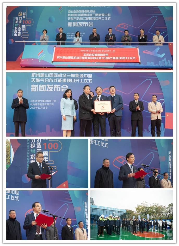 發布會由集團黨委委員、副總經理俞峻主持,由杭州城市能源有限公司總經理黃向東作新聞發布;杭州蕭山國際機場三期建設指揮部黨委副書記翁樟強為開工儀式致辭,他首先贊揚了杭燃集團對建設綠色亞運,打造低碳循環經濟做出的貢獻,并希望將蕭山機場三期能源中心天然氣分布式能源項目打造成精品工程、經典工程。隨后集團黨委副書記、總經理朱琴君為參建臨時黨支部授牌。最后,在現場全體領導嘉賓的見證下,杭州蕭山國際機場能源中心天然氣分布式能源項目正式啟動開工。