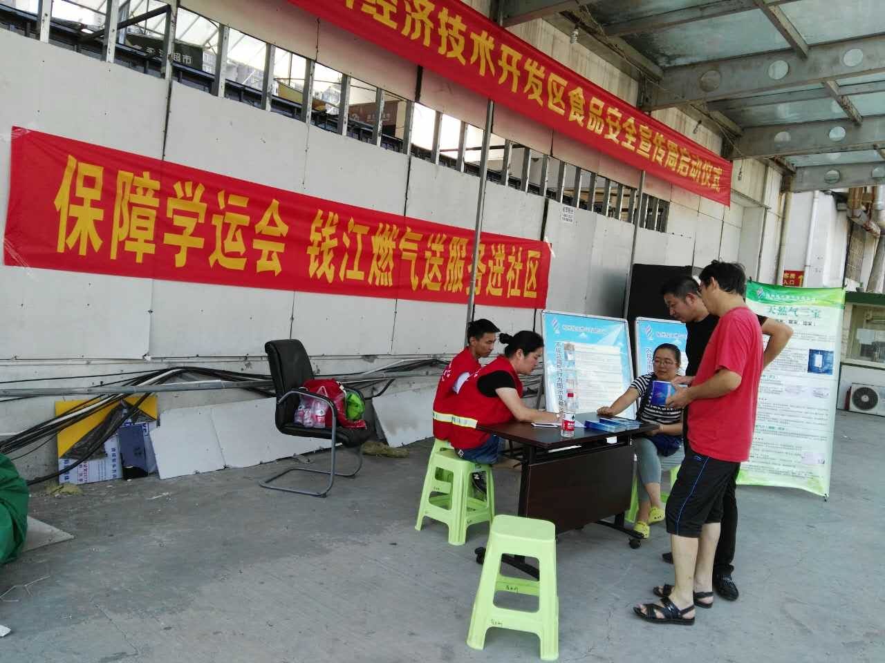 8月19日,錢江公司組織黨團員志愿者在下沙云水苑小區開展“保障學運會,錢江燃氣服務進社區”現場服務活動。此次活動的服務內容有針對居民用戶提供燃氣換管預約、免費上門安檢、安全用氣宣傳和“三寶”業務推廣咨詢等一系列便民服務。活動現場共發放《安全手冊》23本,上門安檢7戶,預約換管6戶,業務咨詢22戶。