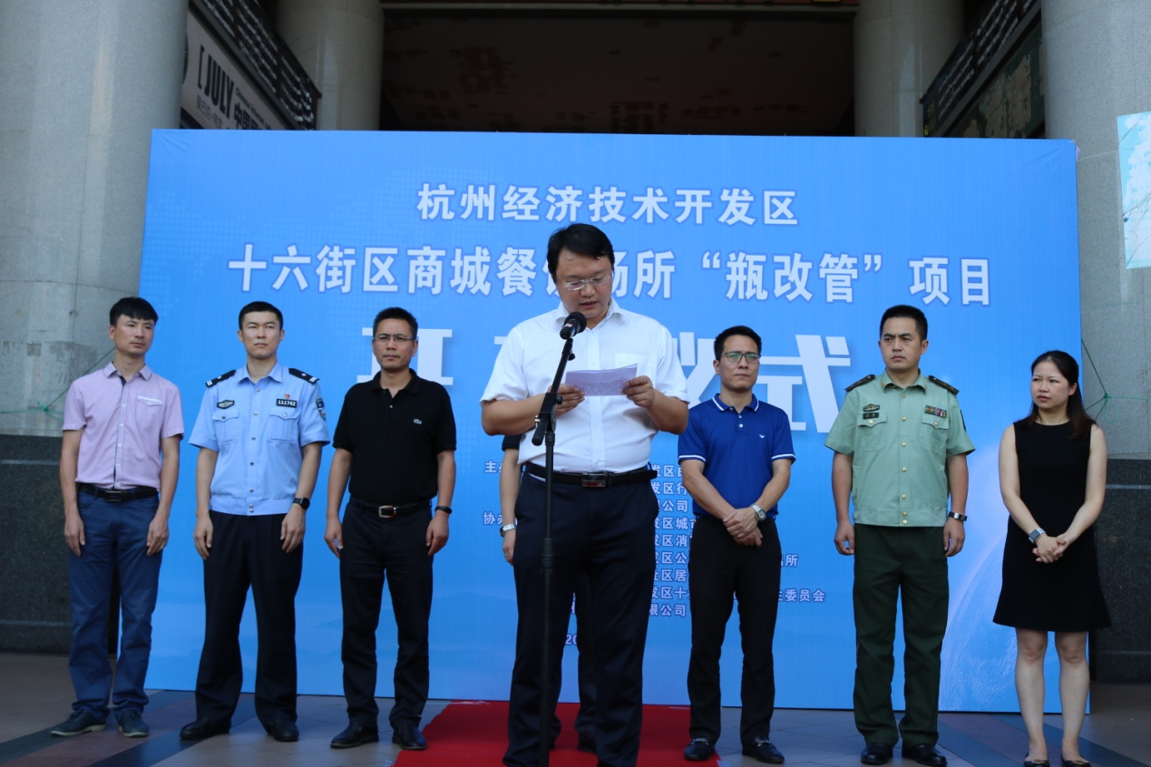 2018年8月30日上午9點半,十六街區商城餐飲場所“瓶改管”項目開工儀式新聞發布會在十六街區北大門如期舉行,本次發布會由錢江公司、經濟技術開發區白楊街道辦事處、行政執法大隊主辦,開發區城市管理辦公室、消防大隊、白楊派出所等6家單位協辦,錢江晚報今日下沙媒體應邀參加。