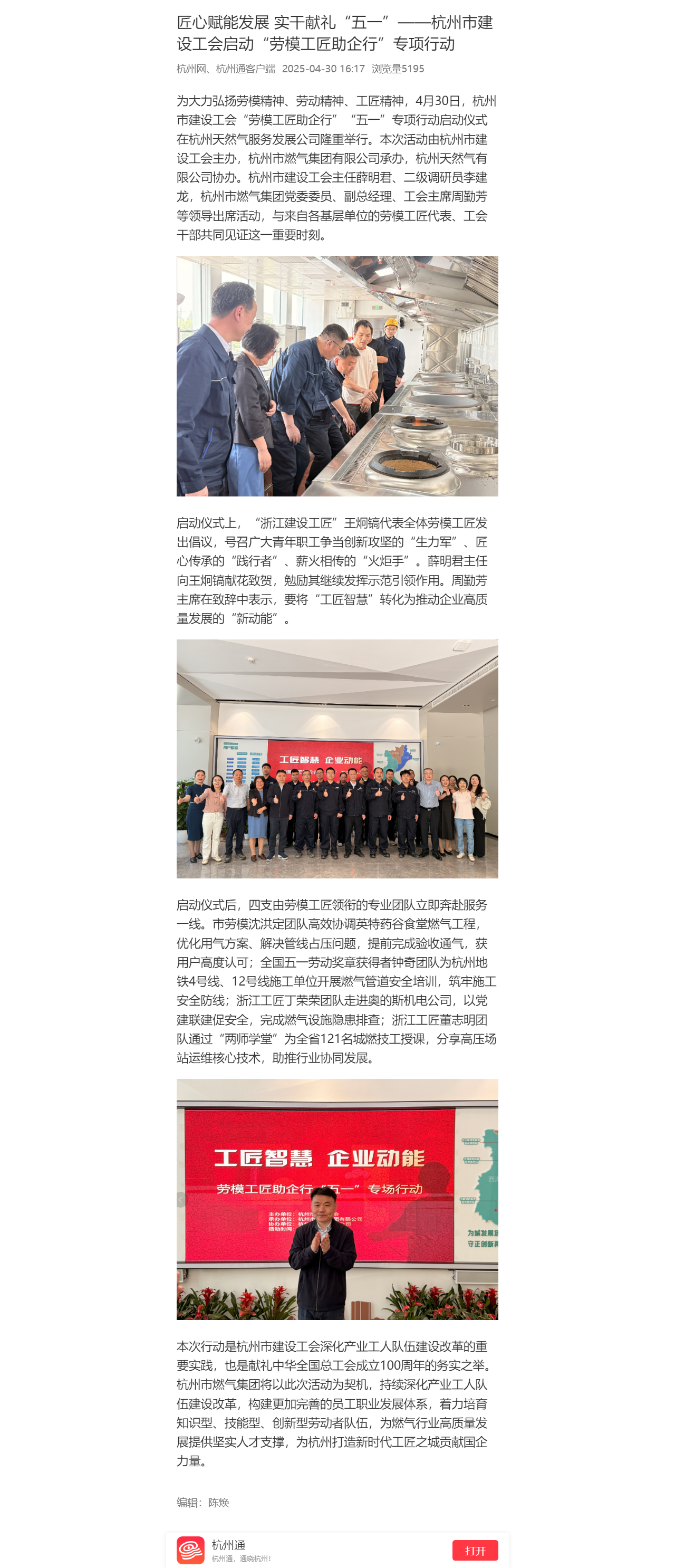 本次行動(dòng)是杭州市建設(shè)工會(huì)深化產(chǎn)業(yè)工人隊(duì)伍建設(shè)改革的重要實(shí)踐,也是獻(xiàn)禮中華全國(guó)總工會(huì)成立100周年的務(wù)實(shí)之舉。杭州市燃?xì)饧瘓F(tuán)將以此次活動(dòng)為契機(jī),持續(xù)深化產(chǎn)業(yè)工人隊(duì)伍建設(shè)改革,構(gòu)建更加完善的員工職業(yè)發(fā)展體系,著力培育知識(shí)型、技能型、創(chuàng)新型勞動(dòng)者隊(duì)伍,為燃?xì)庑袠I(yè)高質(zhì)量發(fā)展提供堅(jiān)實(shí)人才支撐,為杭州打造新時(shí)代工匠之城貢獻(xiàn)國(guó)企力量。