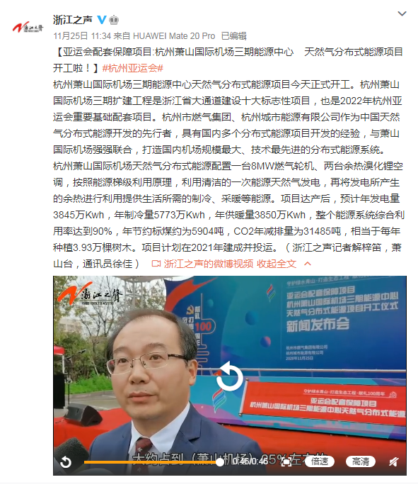 杭州蕭山國際機場天然氣分布式能源配置一臺8MW燃氣輪機、兩臺余熱溴化鋰空調(diào),按照能源梯級利用原理,利用清潔的一次能源天然氣發(fā)電,再將發(fā)電所產(chǎn)生的余熱進行利用提供生活所需的制冷、采暖等能源。項目達產(chǎn)后,預(yù)計年發(fā)電量3845萬Kwh,年制冷量5773萬Kwh,年供暖量3850萬Kwh,整個能源系統(tǒng)綜合利用率達到90%,年節(jié)約標(biāo)煤約為5904噸,CO2年減排量為31485噸,相當(dāng)于每年種植3.93萬棵樹木。項目計劃在2021年建成并投運。(浙江之聲記者解梓笛,蕭山臺,通訊員徐佳)
