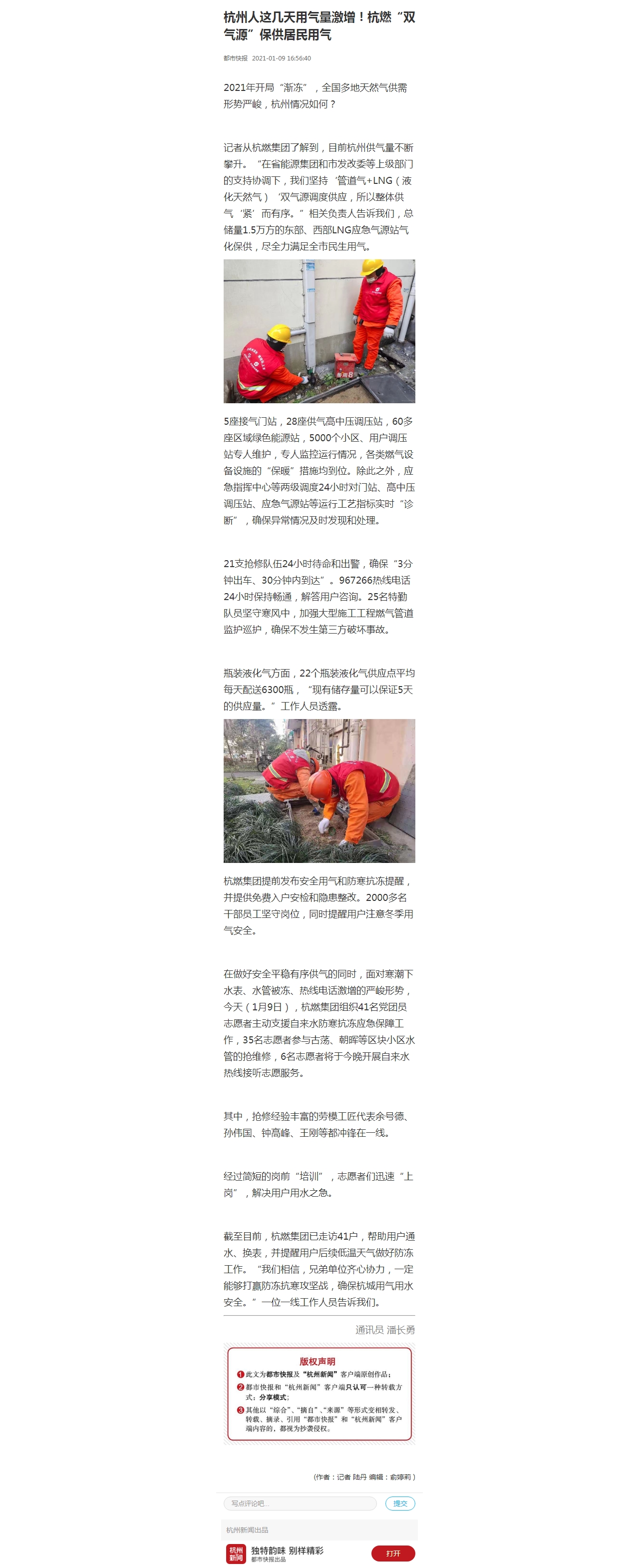 截至目前,杭燃集團已走訪41戶,幫助用戶通水、換表,并提醒用戶后續低溫天氣做好防凍工作。“我們相信,兄弟單位齊心協力,一定能夠打贏防凍抗寒攻堅戰,確保杭城用氣用水安全。”一位一線工作人員告訴我們。