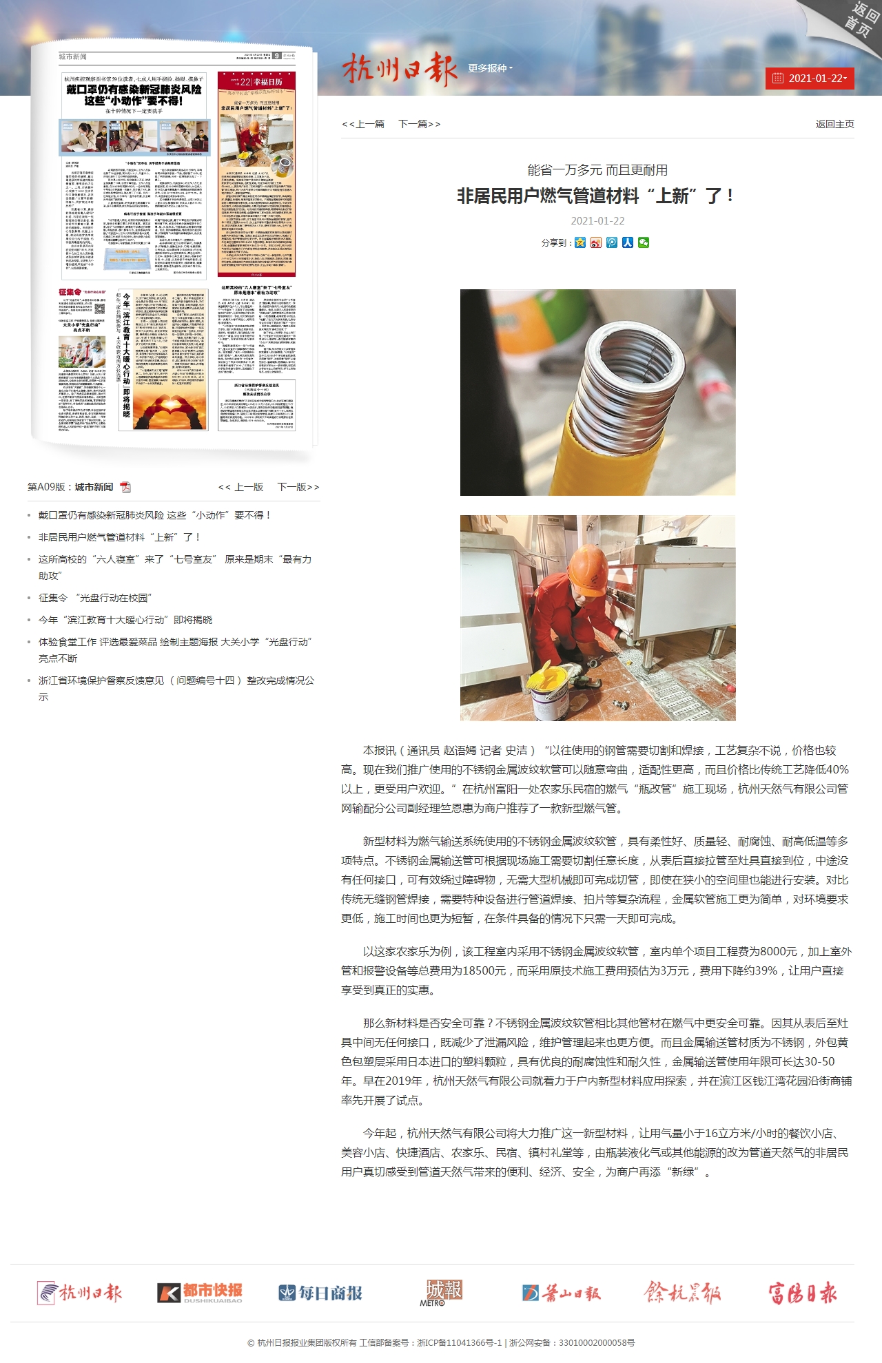 今年起,杭州天然氣有限公司將大力推廣這一新型材料,讓用氣量小于16立方米/小時的餐飲小店、美容小店、快捷酒店、農家樂、民宿、鎮村禮堂等,由瓶裝液化氣或其他能源的改為管道天然氣的非居民用戶真切感受到管道天然氣帶來的便利、經濟、安全,為商戶再添“新綠”。
