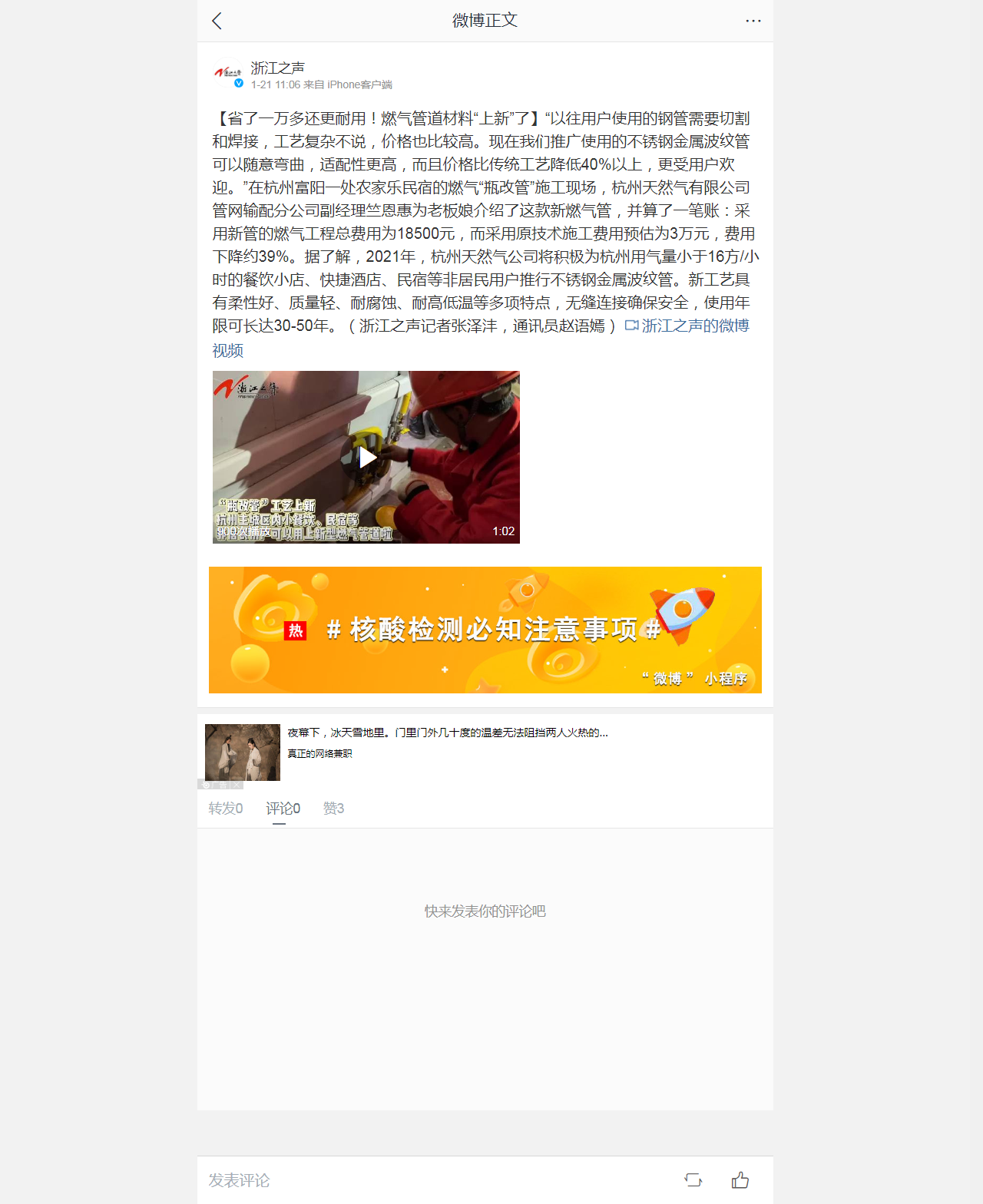 “以往用戶使用的鋼管需要切割和焊接,工藝復雜不說,價格也比較高。現在我們推廣使用的不銹鋼金屬波紋管可以隨意彎曲,適配性更高,而且價格比傳統工藝降低40%以上,更受用戶歡迎。”在杭州富陽一處農家樂民宿的燃氣“瓶改管”施工現場,杭州天然氣有限公司管網輸配分公司副經理竺恩惠為老板娘介紹了這款新燃氣管,并算了一筆賬:采用新管的燃氣工程總費用為18500元,而采用原技術施工費用預估為3萬元,費用下降約39%。據了解,2021年,杭州天然氣公司將積極為杭州用氣量小于16方/小時的餐飲小店、快捷酒店、民宿等非居民用戶推行不銹鋼金屬波紋管。新工藝具有柔性好、質量輕、耐腐蝕、耐高低溫等多項特點,無縫連接確保安全,使用年限可長達30-50年。