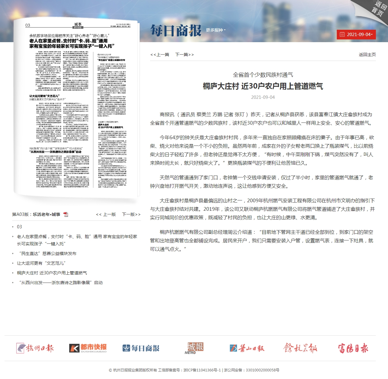 商報訊 (通訊員 蔡美蘭 方鵬 記者 張玎)昨天,記者從桐廬縣獲悉,該縣富春江鎮大莊畬族村成為全省首個開通管道燃氣的少數民族村,該村近30戶農戶也可以和城里人一樣用上安全、安心的管道燃氣。