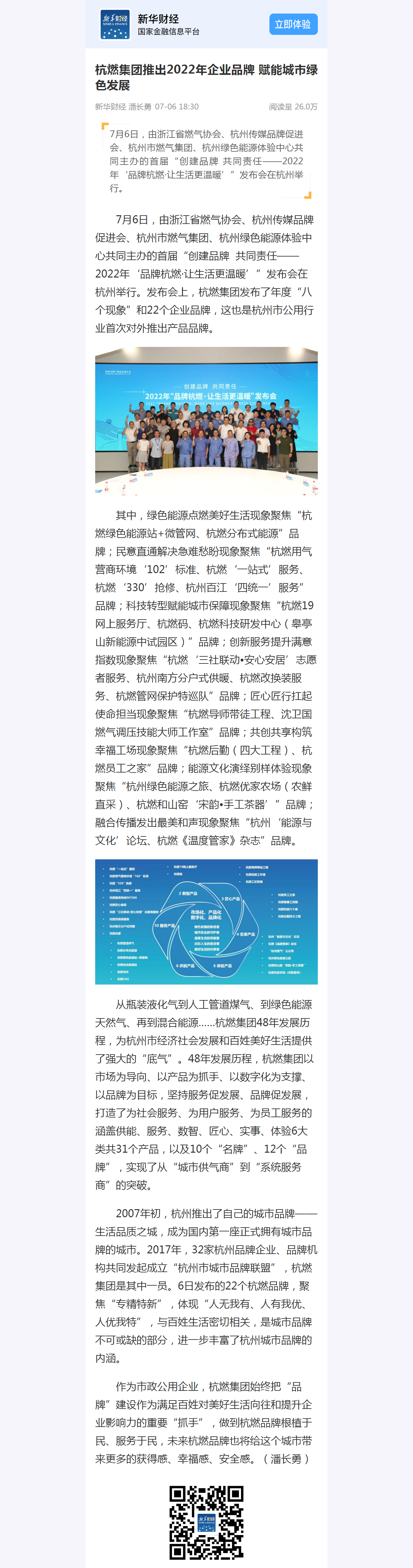 2007年初,杭州推出了自己的城市品牌——生活品質之城,成為國內第一座正式擁有城市品牌的城市。2017年,32家杭州品牌企業、品牌機構共同發起成立“杭州市城市品牌聯盟”,杭燃集團是其中一員。6日發布的22個杭燃品牌,聚焦“專精特新”,體現“人無我有、人有我優、人優我特”,與百姓生活密切相關,是城市品牌不可或缺的部分,進一步豐富了杭州城市品牌的內涵。