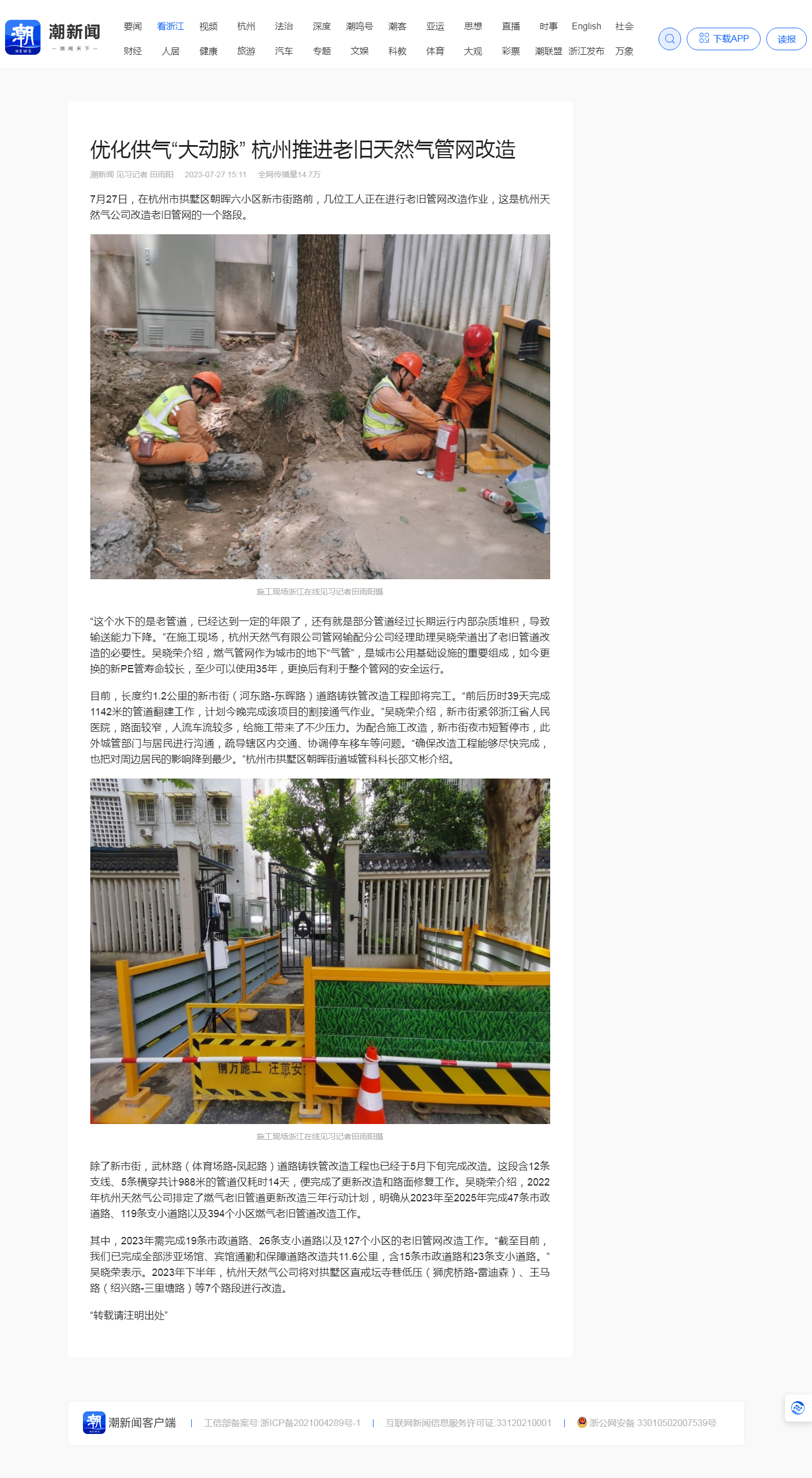7月27日,在杭州市拱墅區朝暉六小區新市街路前,幾位工人正在進行老舊管網改造作業,這是杭州天然氣公司改造老舊管網的一個路段。