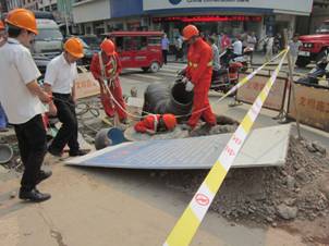演練設定因挖掘機野蠻施工,導致燃氣管網破損,造成燃氣泄漏事故并有人員受傷。上午9點整,建德杭燃公司搶修熱線電話接到報警,稱壽昌中山路與東昌路交叉口疑似燃氣泄漏。巡檢人員立即趕赴現場,經確認為燃氣泄漏,第一時間逐級上報,啟動應急預案,成立應急指揮部,并分組趕赴現場增援。所有公司人員及工程公司西域項目部搶修班在現場指揮的精心組織下,緊張有序地開展了關閉控制閥門、警戒疏散群眾、搶救傷員、防護作業、搶險搶修、修復破損管道、置換通氣、用戶服務等演練。