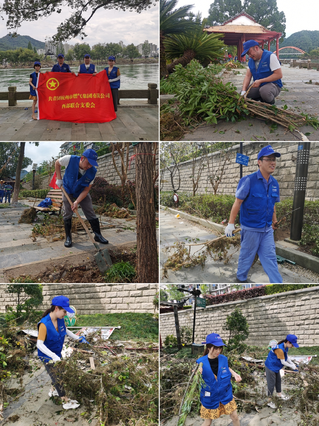 在清理現(xiàn)場,公司青年不畏高溫,就地豎起團旗,發(fā)揚雷厲風行的“杭燃鐵軍”精神,穿上雨靴,帶上手套,拿著掃把、鐵鍬,認真清掃垃圾,并用麻繩將枯枝爛葉捆綁整齊配合環(huán)衛(wèi)工人清運。汗水濕透了每一個人的衣裳。許多的樹枝又大又重又臟,面對這些,團員志愿者們沒有人嫌臟,徒手就搬,說干就干。經過一個下午的通力合作,江濱公園路面現(xiàn)已基本恢復清潔。