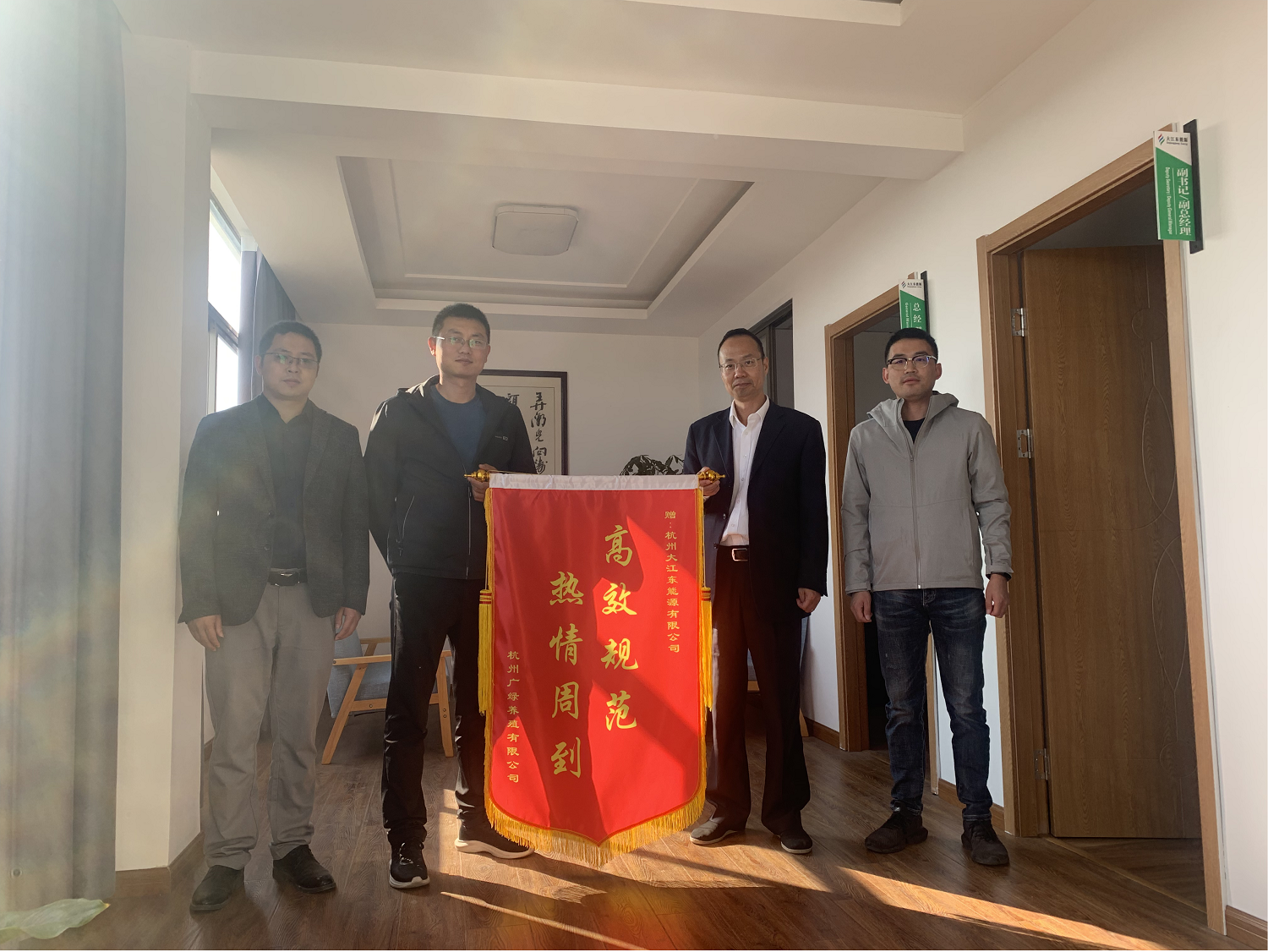 2020年11月4日下午,新希望集團大江東廣綠養殖公司負責人單總專程來到大江東能源公司,將一面印著“高效規范 熱情周到”的錦旗送到了公司副總經理方輝的手上,對公司在廣綠養殖燃氣擴容項目上提供的周到服務和專業態度表示感謝!