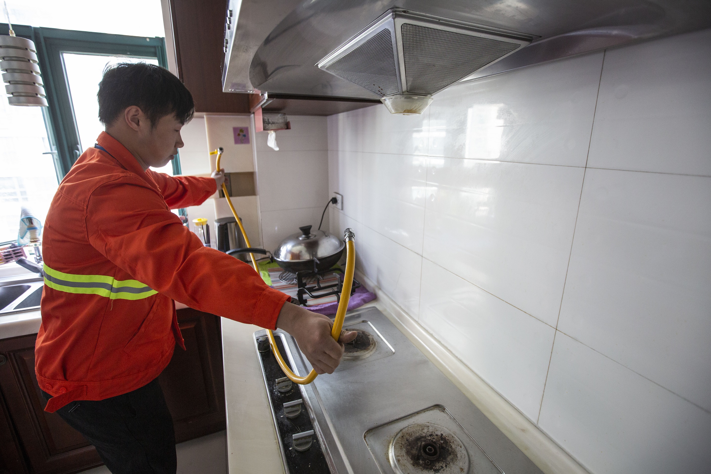 圖為居民用戶更換金屬軟管現場