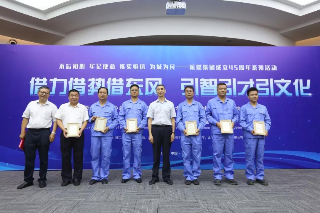 杭燃集團監事會主席金富根、黨委副書記俞磊為楊國華、沈衛國、竺恩惠、鐘奇、王云、余號德頒發杭燃匠心學院首批內訓講師聘書。